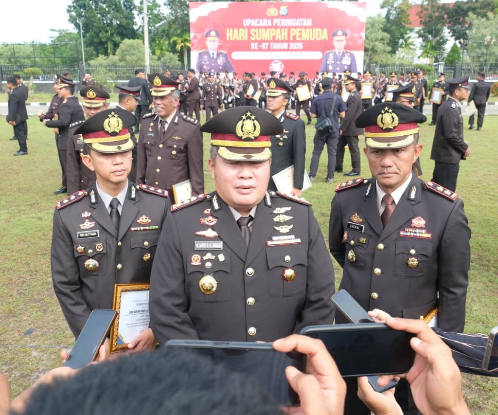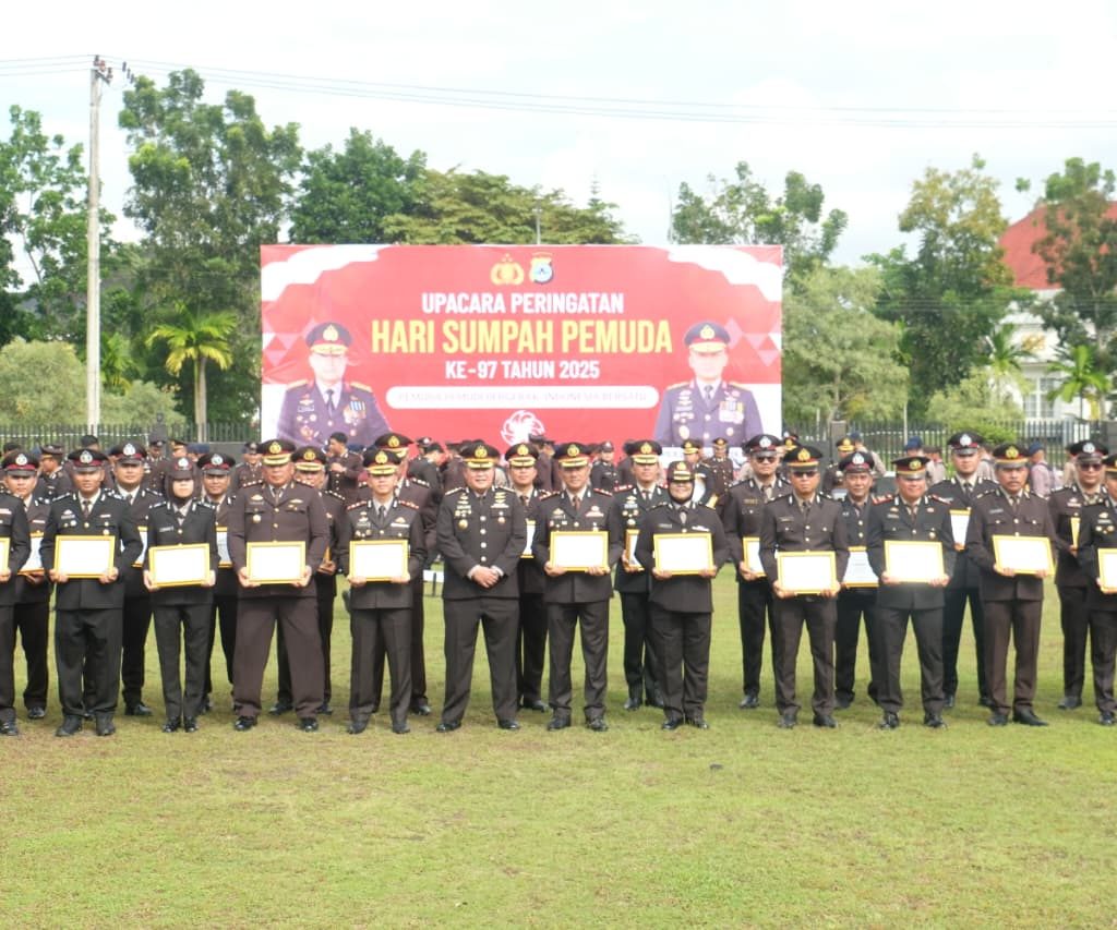 Ketua DPRD Kalsel Dr. (H.C.) H. Supian H.K., S.H. menyerahkan penghargaan dari Gubernur Kalsel kepada perwakilan personel Ditreskrimsus Polda Kalsel dalam upacara peringatan Hari Sumpah Pemuda ke-97 di Mapolda Kalsel, Banjarbaru, Selasa (28/10/2025). (Foto: Humas Polda Kalsel)